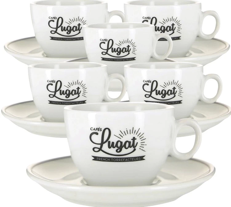 – Son look élégant et épuré (liseret noir sur le rebord des sous-tasses et logo Cafés Lugat noir sur les tasses en porcelaine blanche).