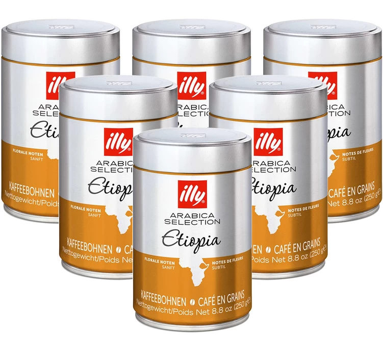 Lot de 6 boîtes de café en grains Illy MonoArabica provenant d’ Ethiopie, plus précisément de la forêt de Yrgacheffe. Ce café en grains Illy pure origine se caractérise par un goût équilibré aux précieuses notes fruitées d’agrumes et de jasmin. Conditionné en boîte métallique préssurisée de 250g.