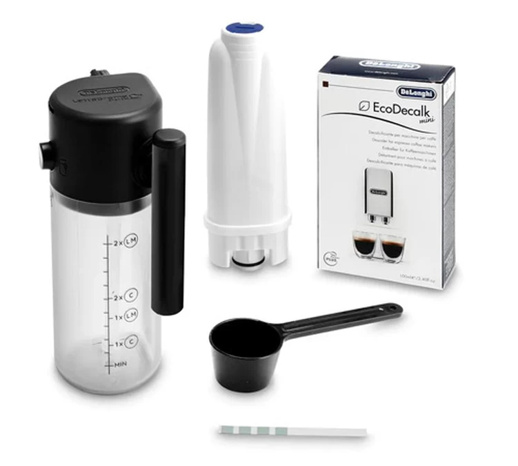 N’hésitez pas à consulter notre article au sujet de l’entretien des expressos broyeurs DeLonghi. Vous pouvez aussi retrouver nos produits d’entretien DeLonghi. L’ensemble présent sur la photo est livré avec la machine (carafe à lait, cartouche filtrante, détartrant liquide, cuillère doseuse et bande de dureté de l’eau).
