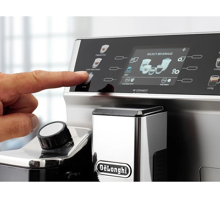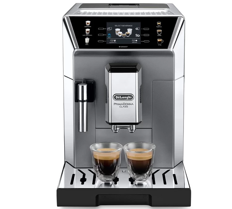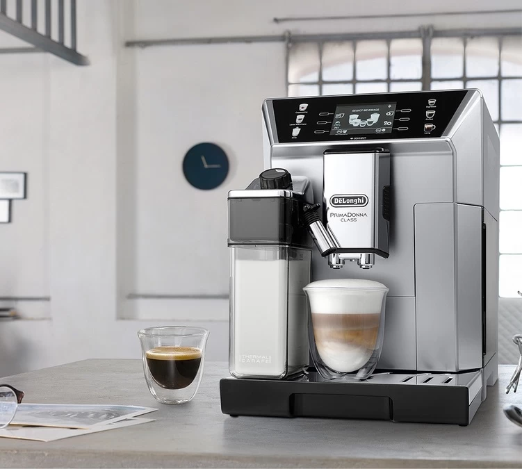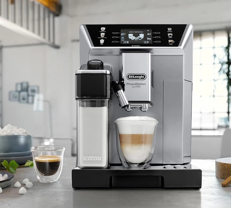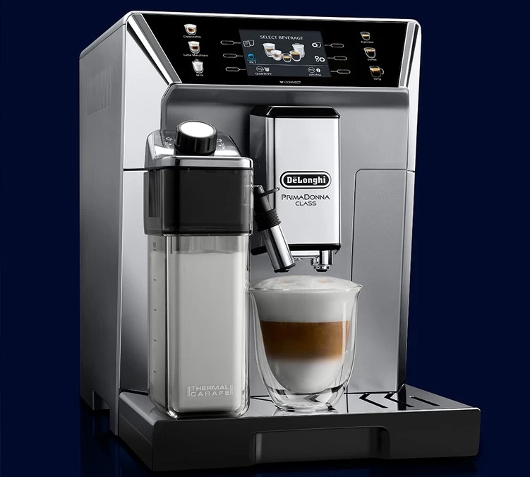La cafetière à grain Delonghi PrimaDonna Class est un robot broyeur connecté haut de gamme : lancez votre boisson depuis de votre canapé !