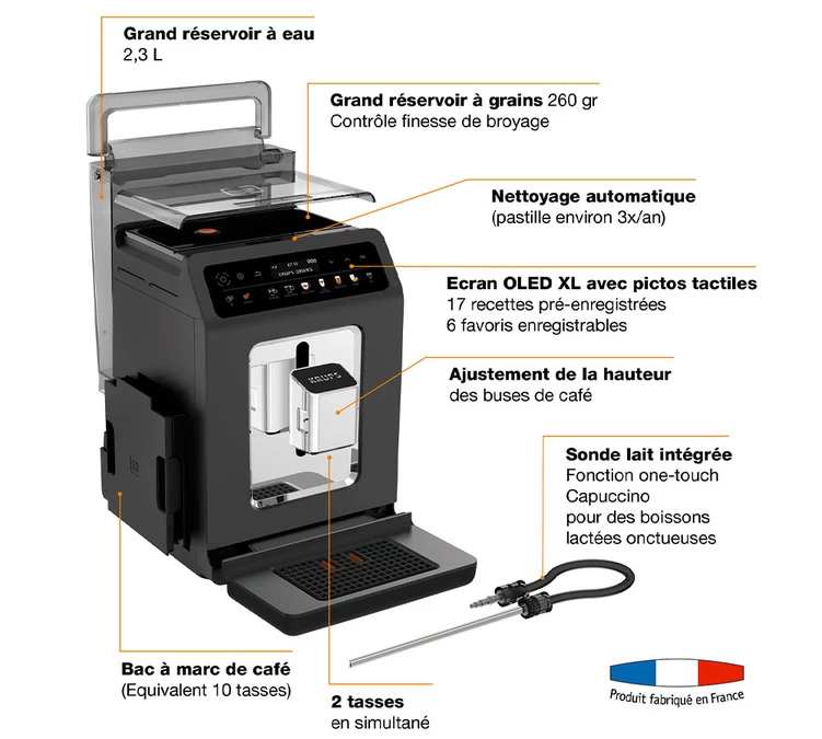 – Elle permet un nettoyage 100% automatique : Krups a mis au point un Système hydraulique autonettoyant permettant de limiter la formation du calcaire et la nécessite d’entretien, assurant ainsi des performances durables.