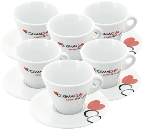 Lot de 6 tasses à cappuccino (15cl) et sous-tasses en porcelaine blanche de la marque italienne Cosmaï Caffé. Ces tasses pour cappuccino Cosmaï allient modernité et qualité haut-de-gamme . Passe au micro-ondes et au lave-vaisselle.