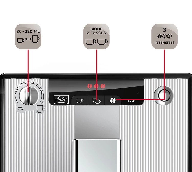 3 niveaux d’intensité de café vous sont proposés (de doux à corsé) avec 3 finesses de mouture différentes.