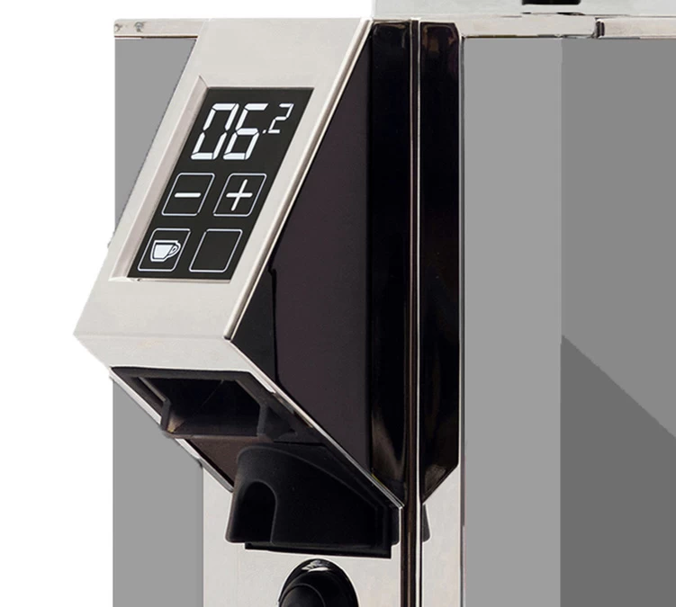 Ce moulin Eureka Mignon Perfetto permet de profiter d’un réglage d’une dose, de deux doses ou à la demande. L’écran digital en façade très intuitif permet de régler très facilement vos doses avec une précision de 0,01 seconde.